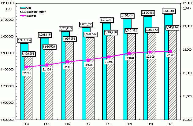 平成21年度(2009年度)において全国の保育所の数は22,925か所。定員の数は2,132,081人でした。