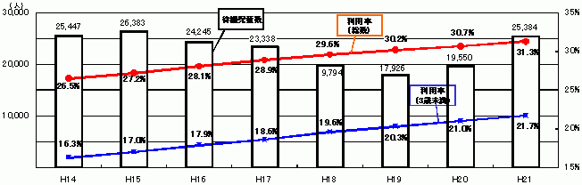 | 平成21年(2009年) | 22,925 | 2,132,081 | 人 | 2,040,974 | 人 | 95.7 | % |