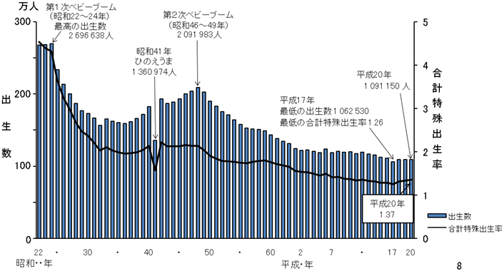 (平成20年 人口動態統計月報年計(概数)の概況 2出生 (1)出生数(2)合計特殊出生率 参照)