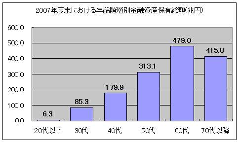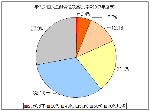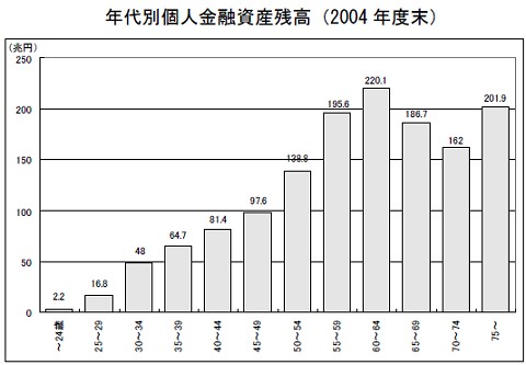 2004年度末の話ではありますが、20代以下が持つ金融資産は全体の1%強です。30代以下に限定しても1割に満たない状況です。一方、定年退職を迎えた60代以降の年齢層だけで過半数を占めています。