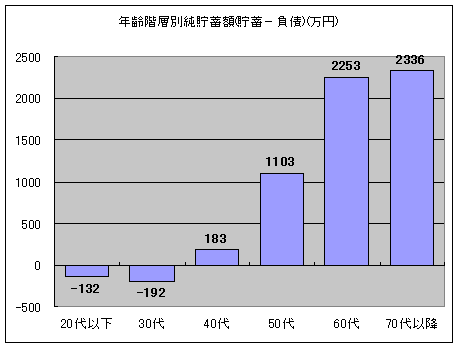 gn-20090130-10.gifこれらの値は「預貯金・保険・有価証券など」の合計額であって、住宅ローンをはじめとした各種負債は考慮していません。考慮した場合、30歳代以下は債務超過(つまり負債の方が大きい)になってしまい、グラフが形成できないほどです。ちなみに年齢階層別の「貯蓄(=金融資産)」と「負債(住宅ローンや月賦支払いなど)」を足した2007年度末における純貯蓄額は次のとおり(下図)です。