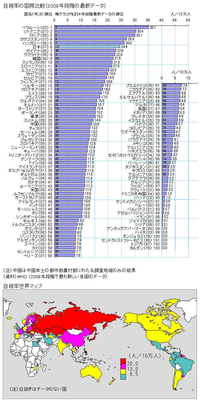 日本の自殺率の高さについては、WHO精神保健部ホセ・ベルトロテ博士は、「日本では、自殺が文化の一部になっているように見える。直接の原因は過労や失業、倒産、いじめなどだが、自殺によって自身の名誉を守るもしくは責任をとるといった倫理規範として自殺がとらえられている。これは他のアジア諸国やキューバでもみられる傾向だ。」と話しています。また、当の日本国民はこうした点に気づきにくいとも指摘されています。